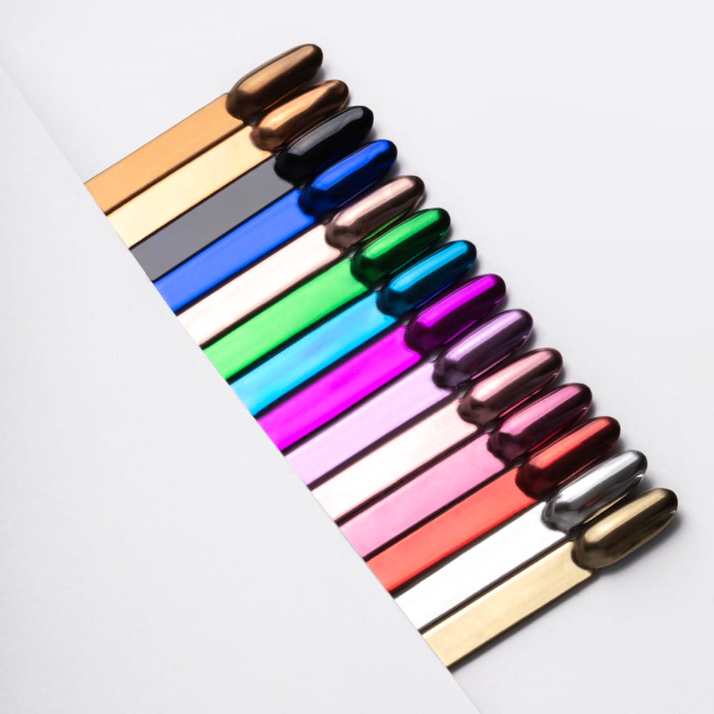 - Na wybrany top lub dedykowany do pyłków typu lustro Mirror Top delikatnie wetrzyj pyłek pacynką/ pędzlem silikonowym lub gąbeczką.