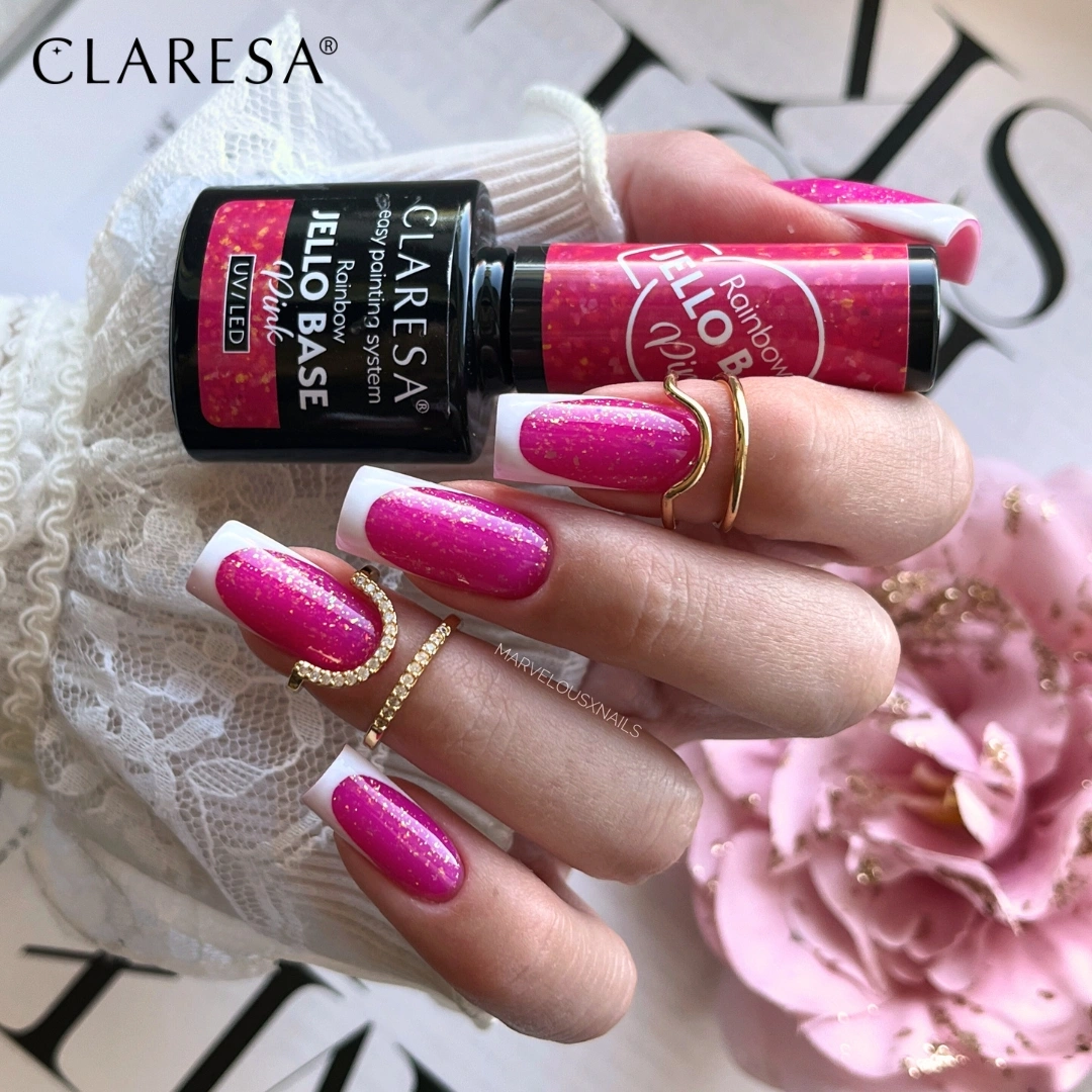 Claresa Rainbow Jello Base Kolorowe galaretki obtoczone w cukrze, słodkie i chrupiące żelki malinki, pucharek z warstwami tęczowej galaretki, zwieńczony odrobiną bitej śmietany… Tobie też właśnie przypomniał się smak beztroskich wakacji? Przywołaj słodkie wspomnienia z kolorową kolekcją Claresa Rainbow Jello Base! 6 półtransparetnych baz hybrydowych w letnich odcieniach żółci, różu, niebieskiego, fioletu i zieleni pozwoli Ci stworzyć idealny manicure przy użyciu jednego produktu! Intensywne kolory z dodatkiem kawałeczków połyskującej folii będą świetnie pasować do wakacyjnego manicure przy lekko opalonej skórze, ale też do szalonych festiwalowych stylizacji. Dzięki średnio rzadkiej konsystencji baza aplikuje się łatwo i szybko, dzięki czemu możesz pomalować 4 paznokcie za jednym razem (poza kciukami).