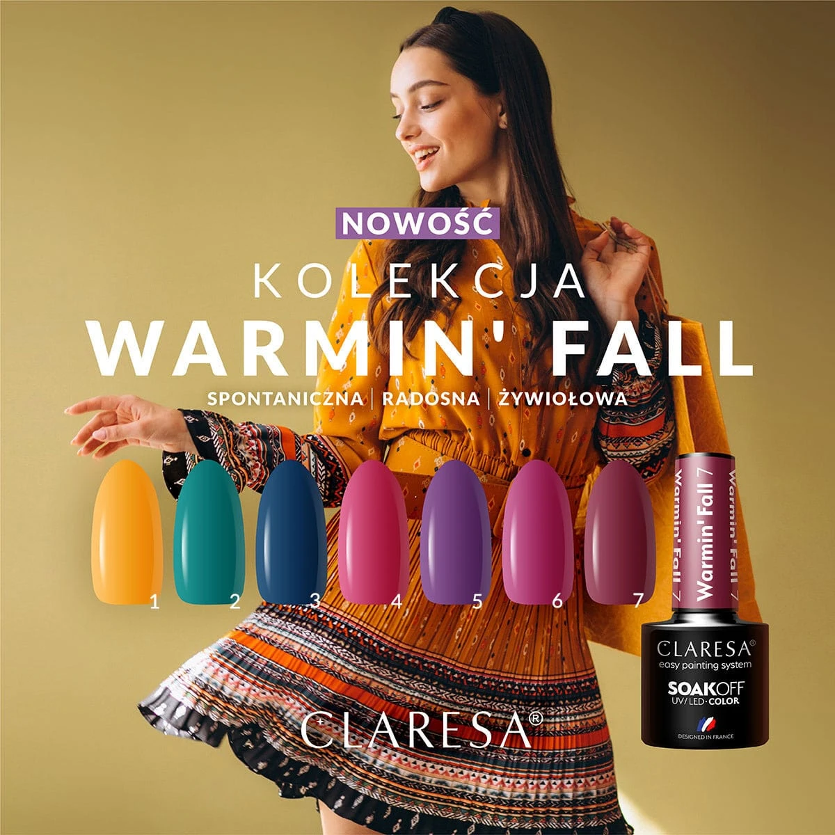 Jesień kojarzy się z całą paletą nasyconych, ciepłych kolorów. Kolekcja Warmin’ Fall to odpowiedź na najbardziej palące trendy jesieni 2021- znajdziesz tu nasycone kolory żółci, zieleni, granatu oraz czerwieni i różu. Te właśnie kolory królują o tej porze roku na wybiegowych pokazach największych projektantów mody z Francji, Włoch i USA. Jeśli chcesz iść z duchem mody jesieni 2021, wybierz kolekcję lakierów hybrydowych Warmin’ Fall i twórz najmodniejsze jesienne stylizacje.