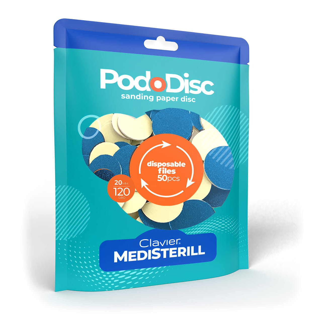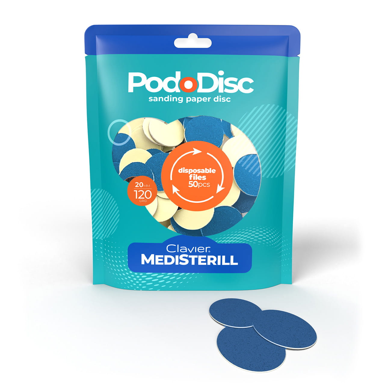 Czym są i do czego służą nakładki ścierne na nośnik Pododisc CLAVIER? Nakładki ścierne do pedicure Clavier Medisterill, to wymienne nakładki ścierne o ziarnistości 120 grit, 50szt.,rozmiar M – 20mm, na nośnik Pododisc. Okrągłe, trwałe, samoprzylepne podkłady mają mocną podstawę klejącą, która niezawodnie utrzymuje materiał ścierny na metalowej powierzchni nośnika, uniemożliwiając jego ślizganie się lub oderwanie.