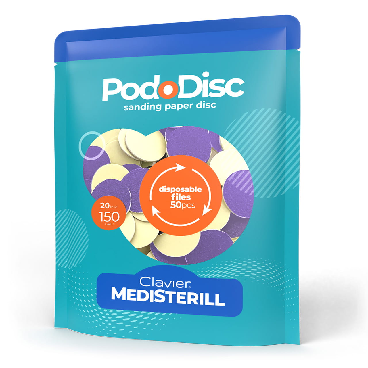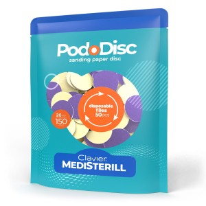 Czym są i do czego służą nakładki ścierne na nośnik Pododisc CLAVIER? Nakładki ścierne do pedicure Clavier Medisterill, to wymienne nakładki ścierne o ziarnistości 150grit, 50szt.,rozmiar M – 20mm, na nośnik Pododisc. Okrągłe, trwałe, samoprzylepne podkłady mają mocną podstawę klejącą, która niezawodnie utrzymuje materiał ścierny na metalowej powierzchni nośnika, uniemożliwiając jego ślizganie się lub oderwanie.