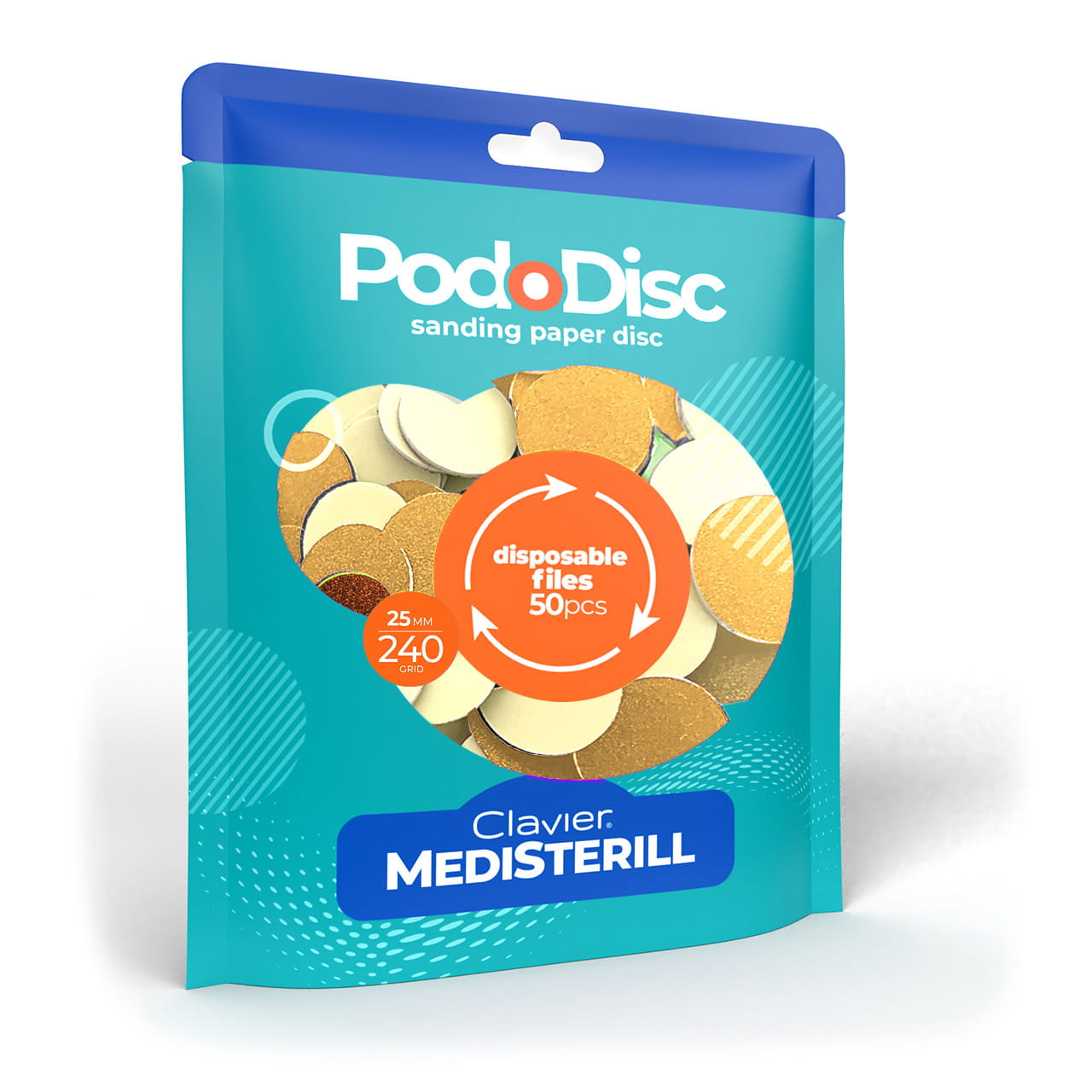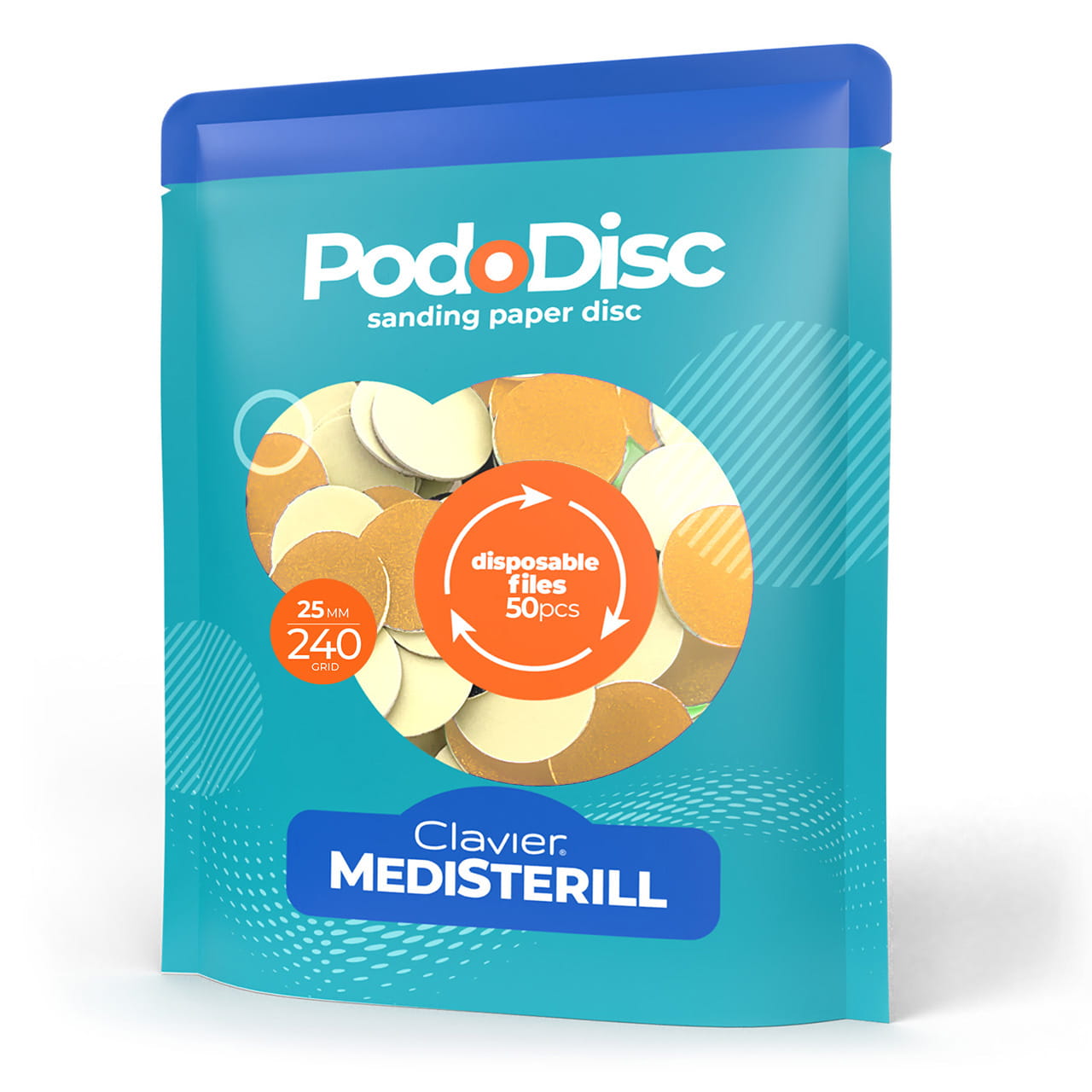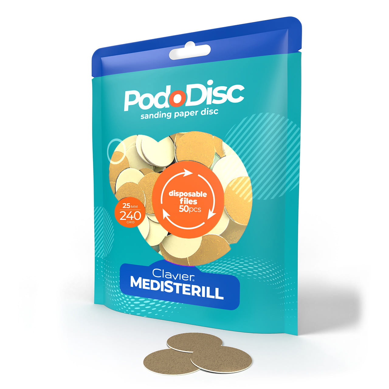 Czym są i do czego służą nakładki ścierne na nośnik Pododisc CLAVIER? Nakładki ścierne do pedicure Clavier Medisterill, to wymienne nakładki ścierne o ziarnistości 240grit, 50szt.,rozmiar L – 25mm, na nośnik Pododisc. Okrągłe, trwałe, samoprzylepne podkłady mają mocną podstawę klejącą, która niezawodnie utrzymuje materiał ścierny na metalowej powierzchni nośnika, uniemożliwiając jego ślizganie się lub oderwanie.