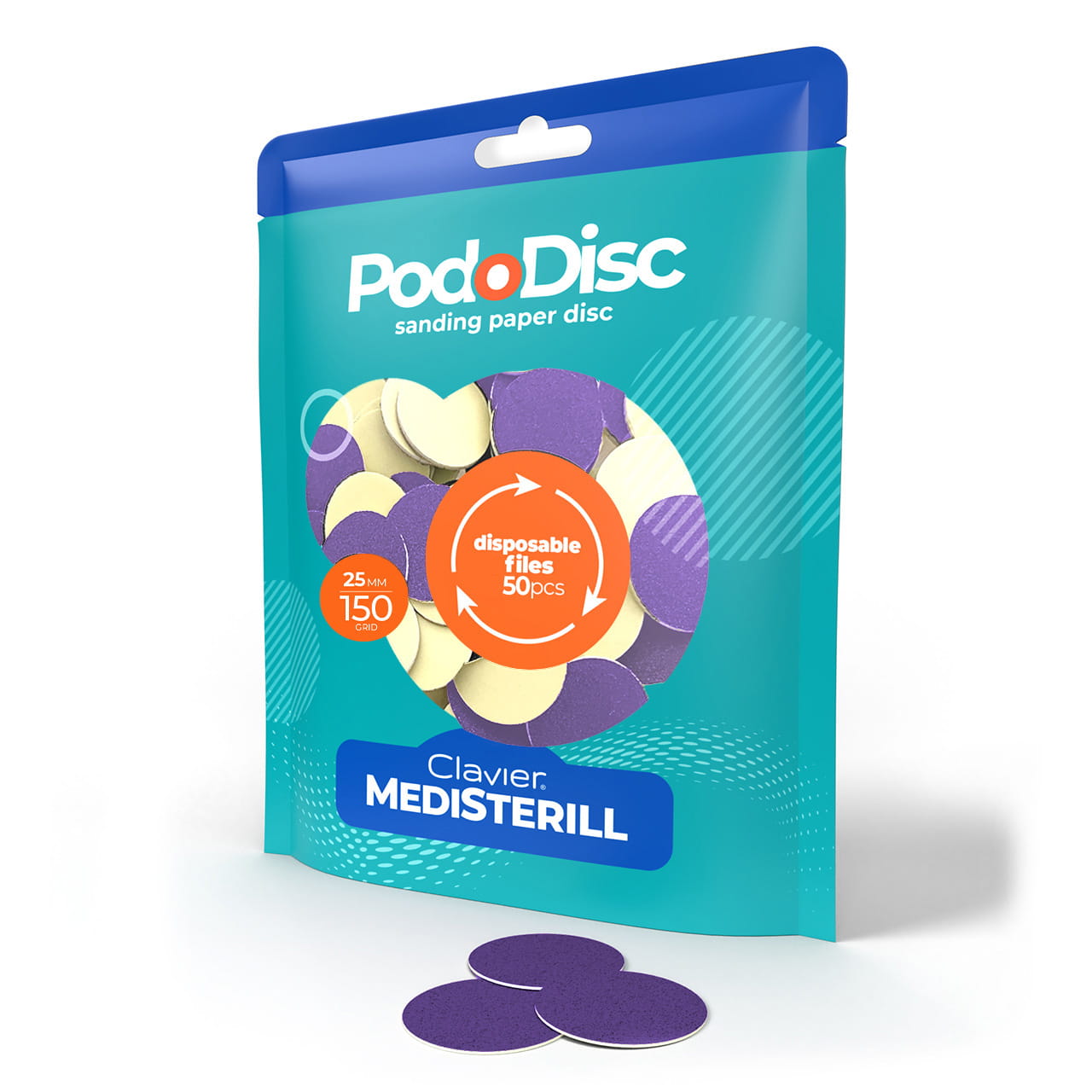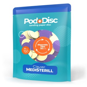 Czym są i do czego służą nakładki ścierne na nośnik Pododisc CLAVIER? Nakładki ścierne do pedicure Clavier Medisterill, to wymienne nakładki ścierne o ziarnistości 150grit, 50szt.,rozmiar L – 25mm, na nośnik Pododisc. Okrągłe, trwałe, samoprzylepne podkłady mają mocną podstawę klejącą, która niezawodnie utrzymuje materiał ścierny na metalowej powierzchni nośnika, uniemożliwiając jego ślizganie się lub oderwanie.