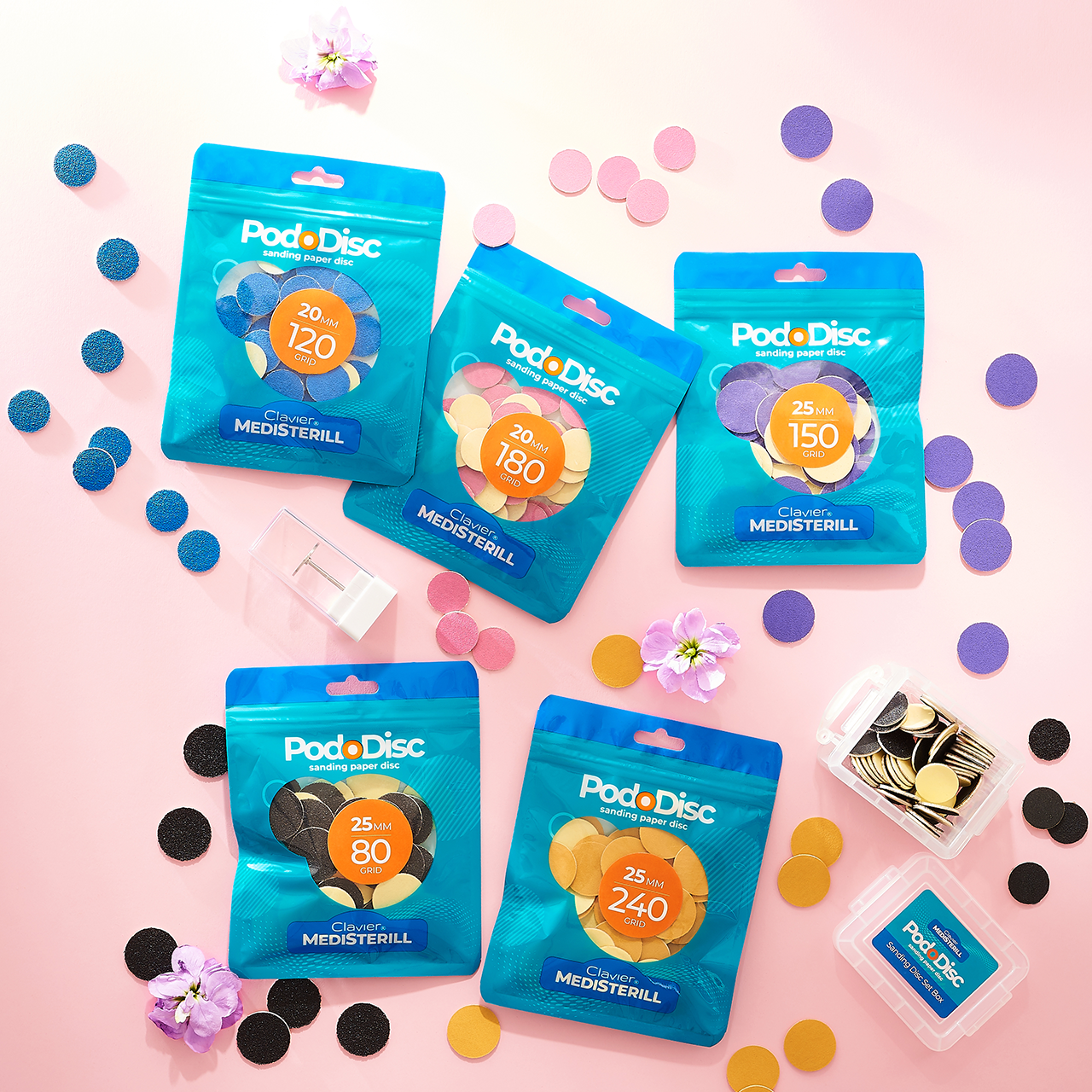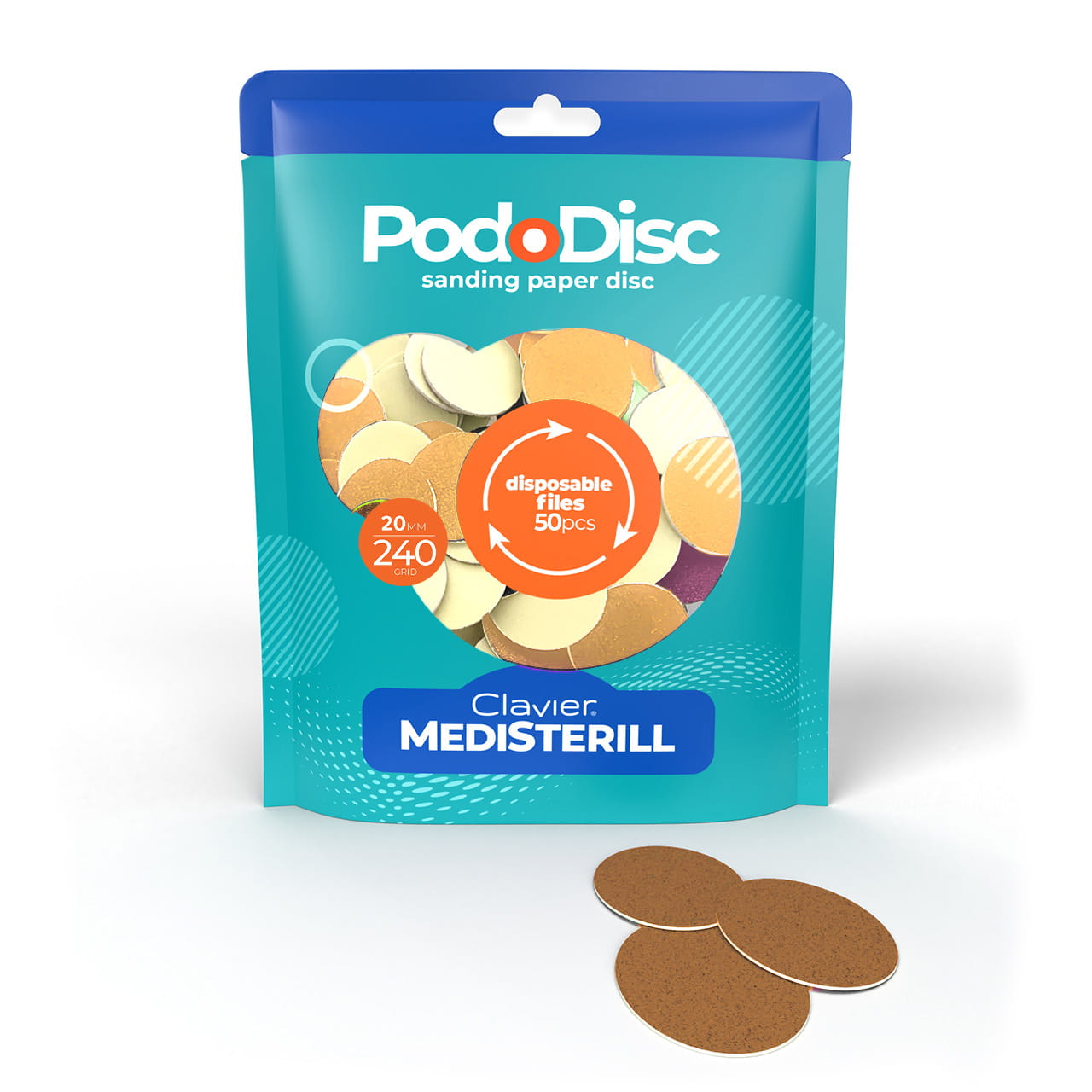 Czym są i do czego służą nakładki ścierne na nośnik Pododisc CLAVIER? Nakładki ścierne do pedicure Clavier Medisterill, to wymienne nakładki ścierne o ziarnistości 240 grit, 50szt.,rozmiar M – 20mm, na nośnik Pododisc. Okrągłe, trwałe, samoprzylepne podkłady mają mocną podstawę klejącą, która niezawodnie utrzymuje materiał ścierny na metalowej powierzchni nośnika, uniemożliwiając jego ślizganie się lub oderwanie.