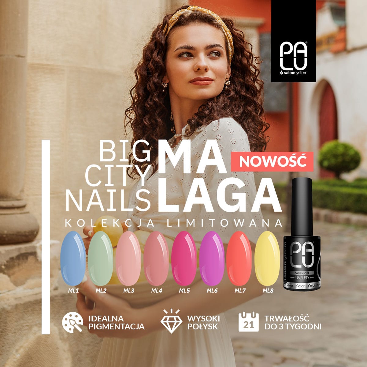 Wyjątkowe miasto na styku morza i gór, które łączy historię i współczesność. Przenieś się do gorącej Hiszpanii razem z kolekcją Palu Malaga i odkryj uroki tej niezwykłej stolicy regionu Costa del Sol. Paleta 8 lakierów hybrydowych łączy w sobie kolory ziemi ‒ delikatną zieleń, błękit i nude ‒ oraz pełne słońca i energii żółć, koral i róż.