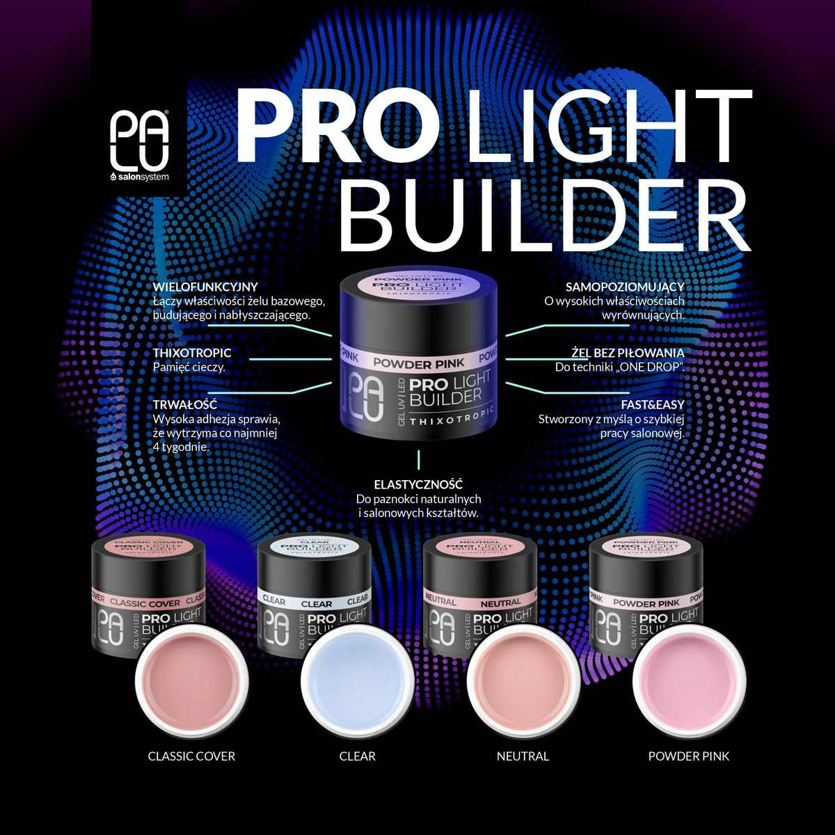Nowoczesna formuła stworzona została tak, by umożliwić zastosowanie techniki „żel bez piłowania”, zabezpieczyć tunel przedłużonych paznokci przed rozprężeniem i skrócić czas wykonania usługi do minimum. Szczególnie polecany do szybkich uzupełnień i korekt stylizacji. PRO LIGHT BUILDER GEL to żel, który posiada właściwości produktu bazowego, budującego i nabłyszczającego. W swojej budowie zawiera substancje adhezyjne, które zwiększają przyczepność do naturalnej płytki paznokcia, substancje budujące i nabłyszczające. Aby osiągnąć optymalny efekt przyczepności przy cienkich, problematycznych płytkach warto zastosować wcierkę z dowolnej bazy Palu. Precyzyjnie dopasowana lepkość żelu daje gwarancję, że konsystencja jest średniogęsta i szybko rozkłada się na paznokciu. Żel o tej lepkości dobrze odchodzi od pędzelka. Żel jest wytrzymały, odporny na zadrapania i o wysokim, długo utrzymującym się połysku.