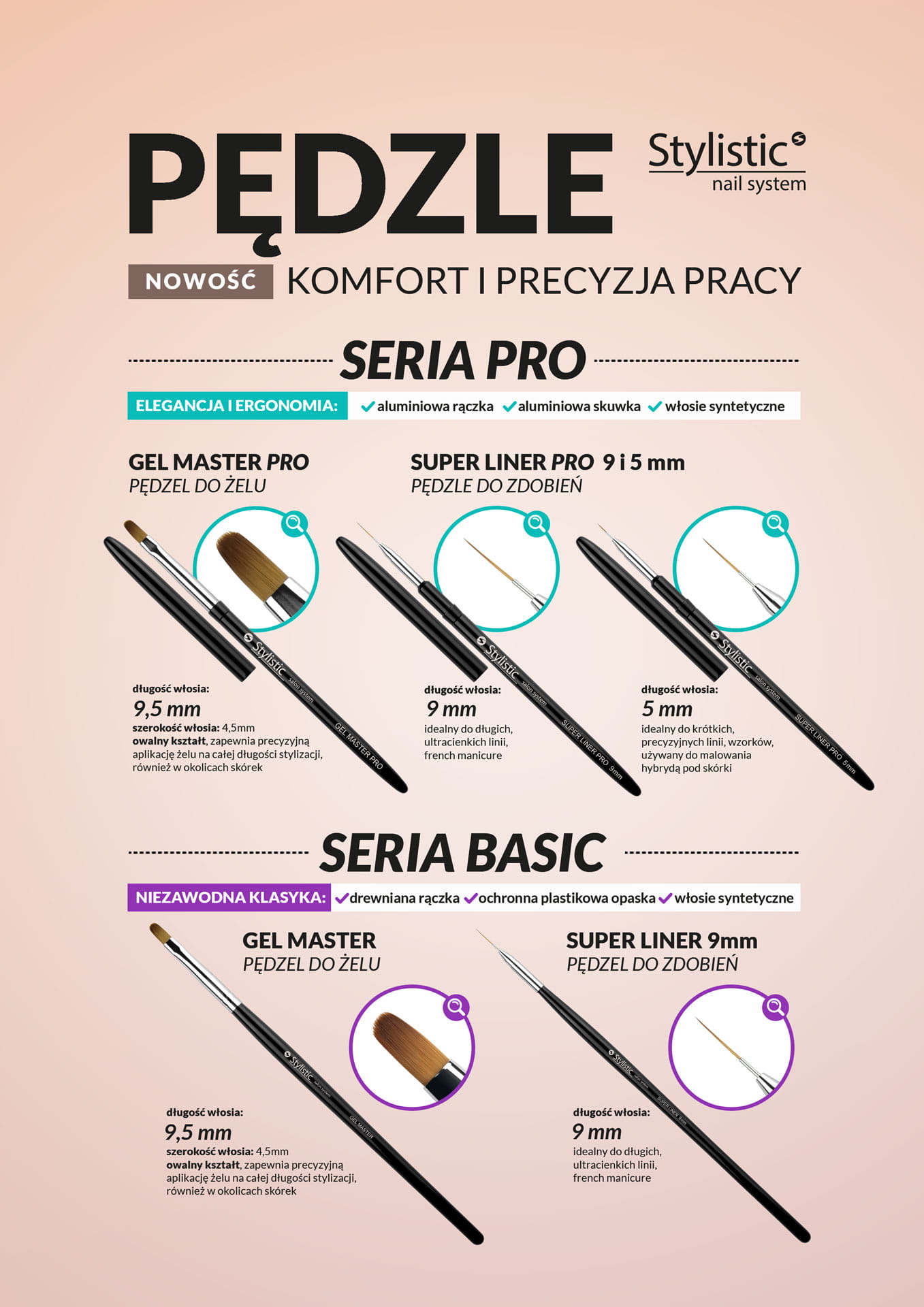 Pędzelek Gel Master Pro marki Stylistic to niezbędne narzędzie w arsenale każdej profesjonalnej manicurzystki. Jego płaski, owalny kształt doskonale sprawdza się podczas aplikacji żelu. Zaokrąglona końcówka pędzla umożliwia precyzyjną pracę w delikatnych obszarach skórek.