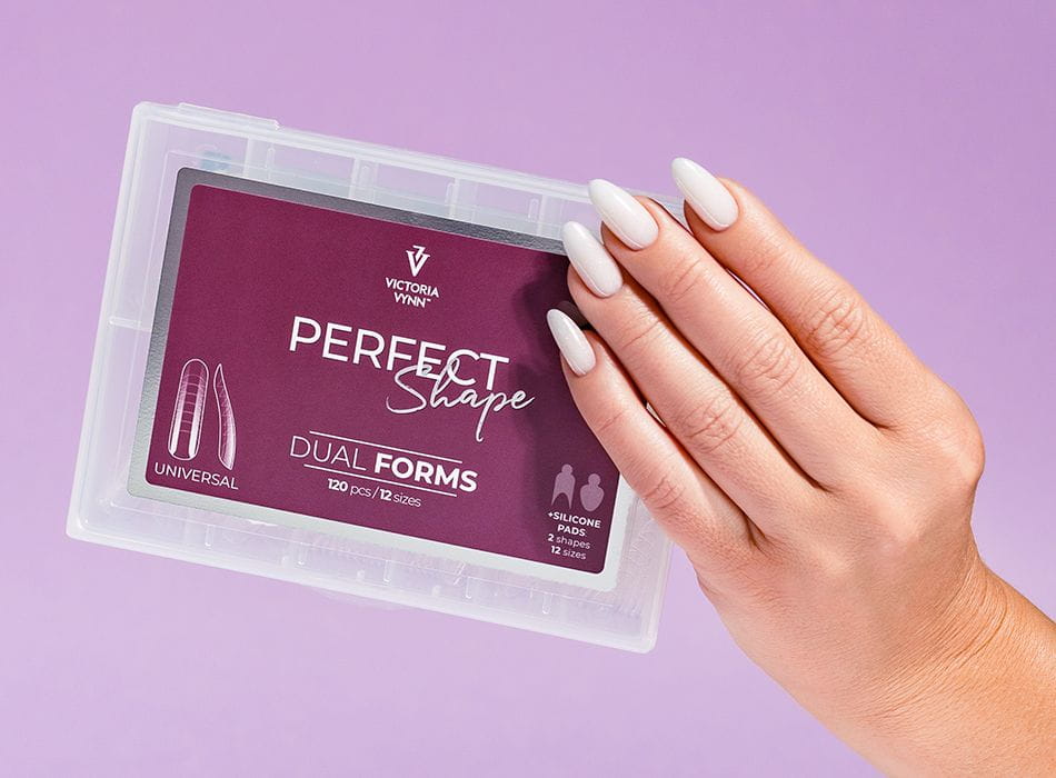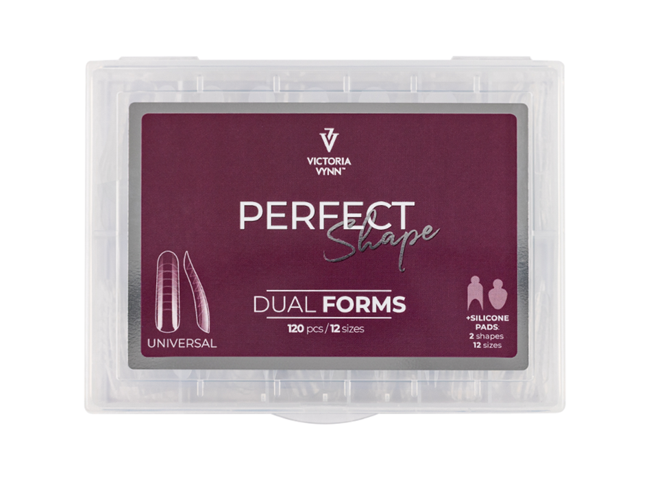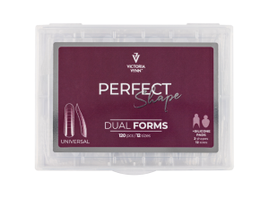 Dual formy występują w 3 różnych kształtach, a każdy z nich w 12 rozmiarach. Universal - Każde opakowanie PERFECT Shape DUAL FORMS zawiera 120 sztuk foremek w dwunastu rozmiarach, od 0 do 11. Do zestawu dołączone są 2 rodzaje silikonowych szablonów do French manicure.