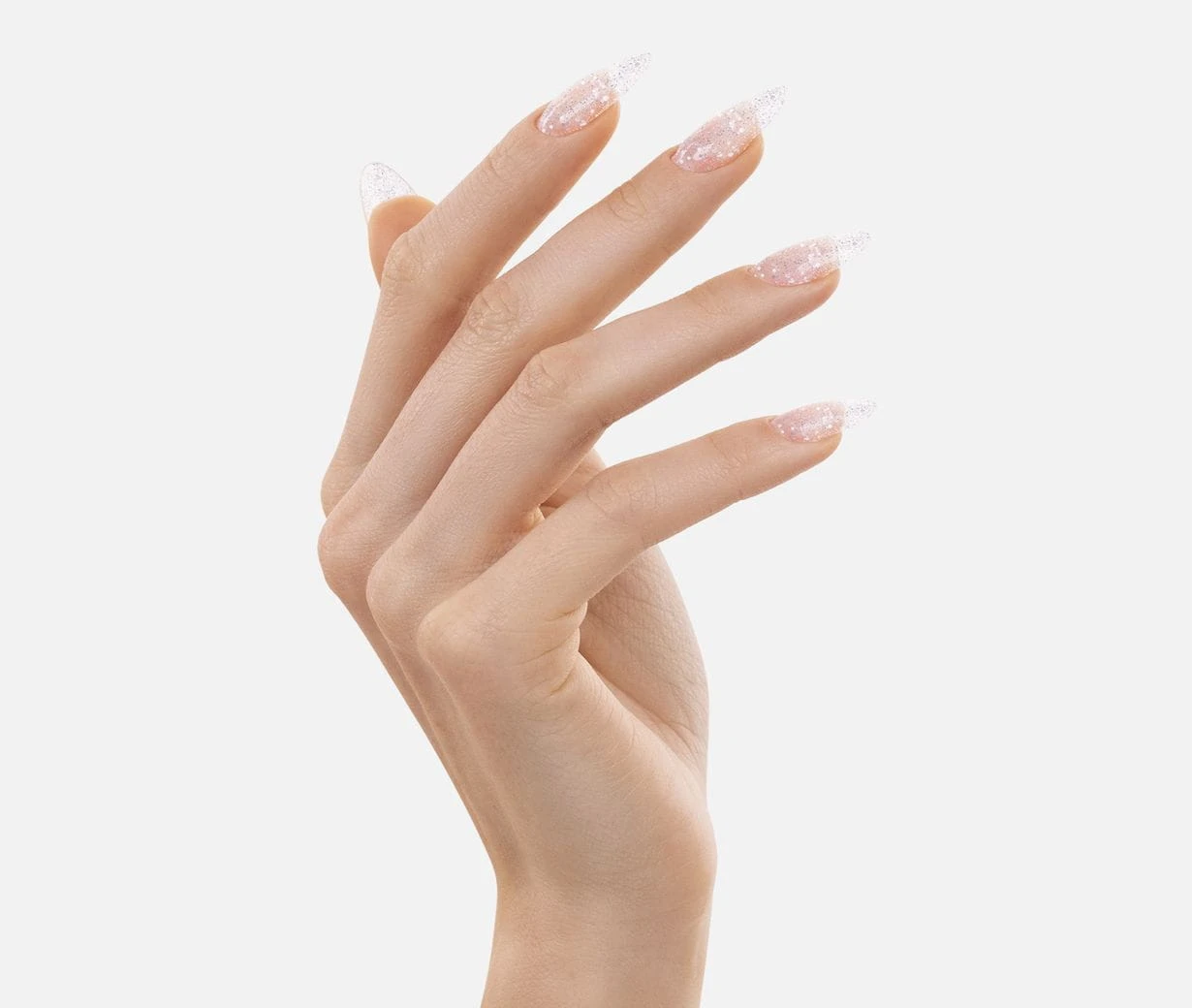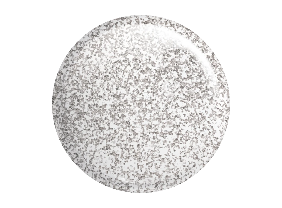 Srebrne, różnej wielkości drobinki Luxury Silver iskrzą się w transparentnej masie. Kremowy lakier hybrydowy o doskonałym kryciu i trwałości.