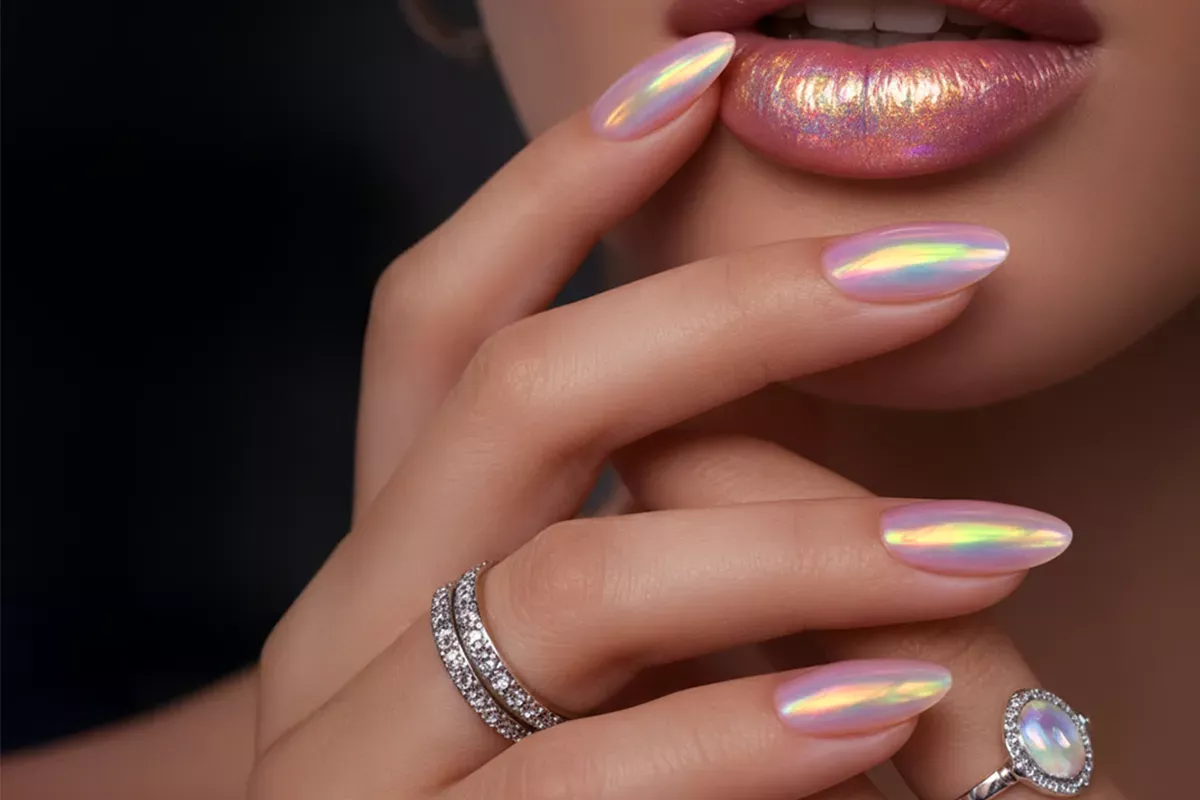 Przenieś nieziemski blask na swoje dłonie dzięki pyłkowi aurora, który tworzy na paznokciach gładką, opalizującą i lśniącą taflę.